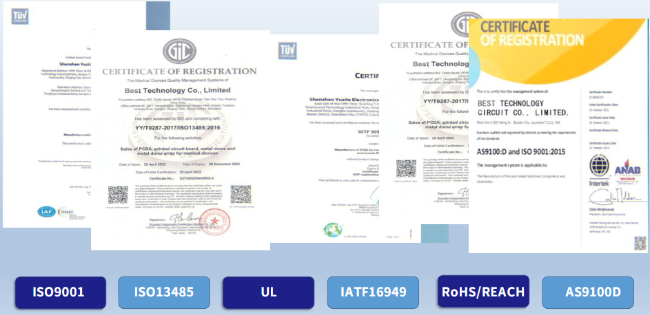 EBest Circuit holds a comprehensive suite of global quality certifications, all subject to annual audits, to support quick turn PCB assembly across all major electronics industries. These credentials form the foundation of every fast-turn project we complete, with zero non-conformities recorded in three consecutive audit cycles.